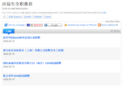 这两天用yahoo pipes给应届生网站做了一个RSS输出,内容为校园招聘和应届生全职招聘信息。引用页为全职推荐信息,Pipes成果在此,这个是Feed地址。这个pipe刚刚完工,可靠性需时间验证,欢迎大家帮忙测试。